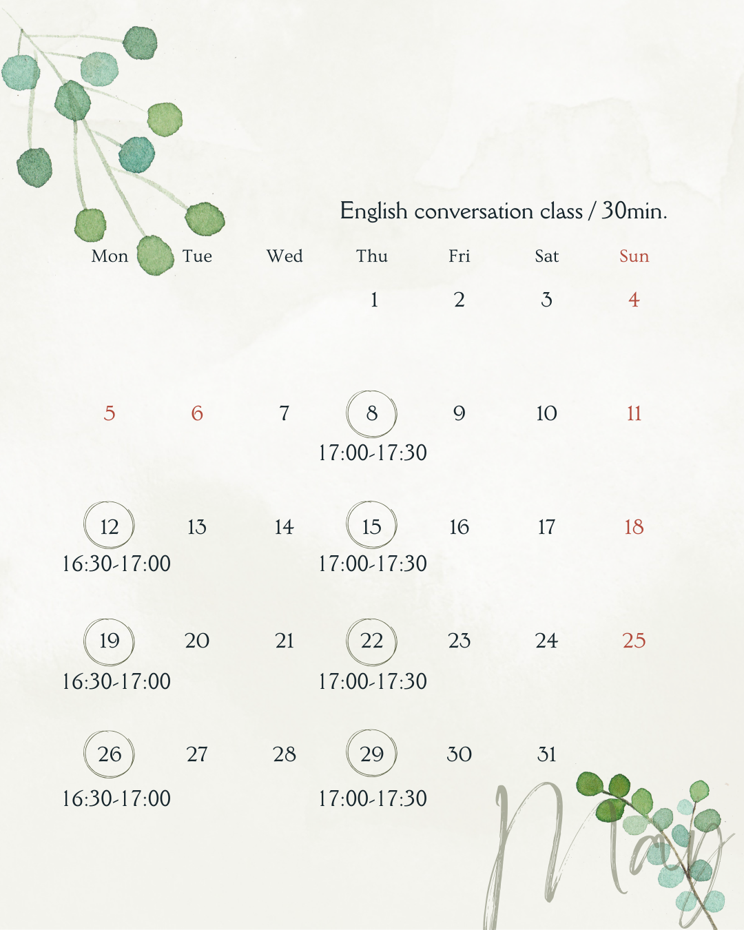 online lesson schedule in May Lesson schedule / online lesson 2025.05.07 高校生~大人向けオンライン英会話クラス5月のスケジュールです。レッスン内容などに関しましは、お気軽にお問い合わせください★